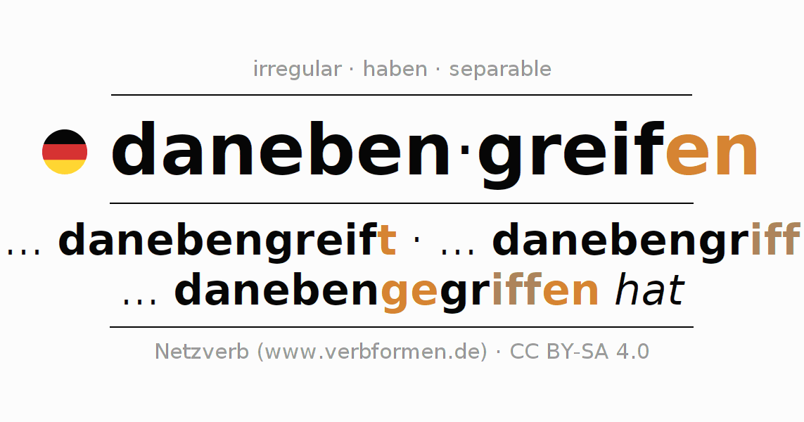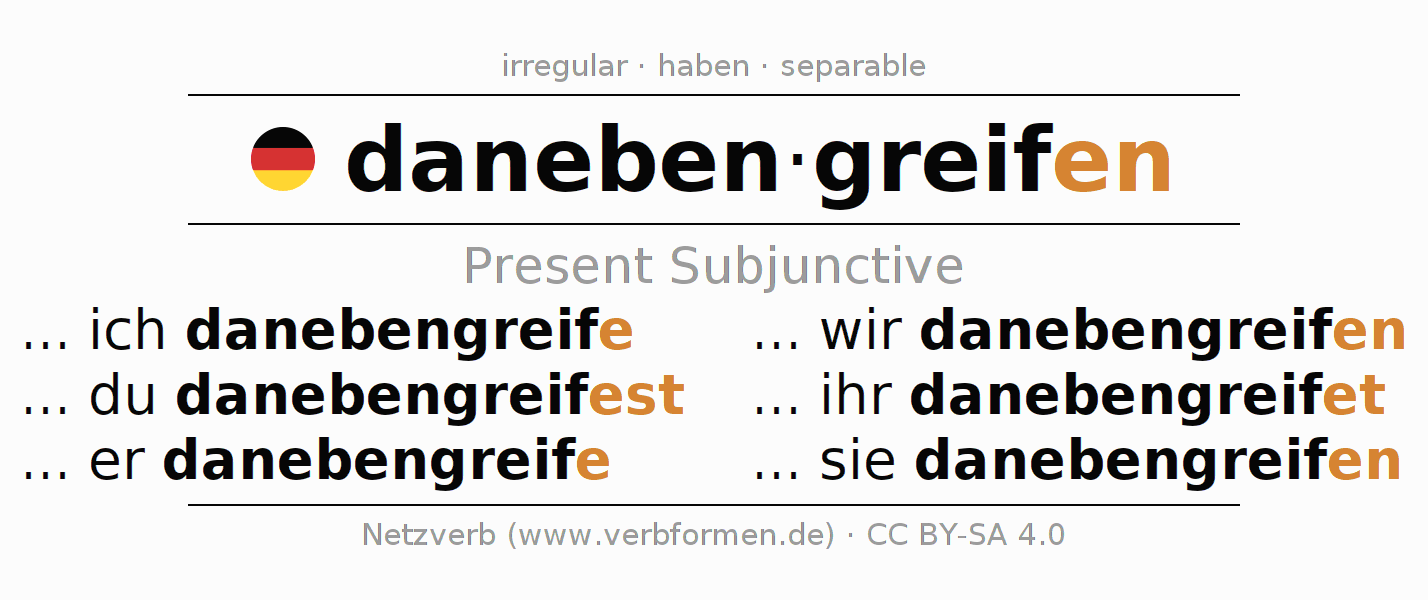 The verb danebengreifen fully conjugated in all persons and numbers in the Subjunctive Present