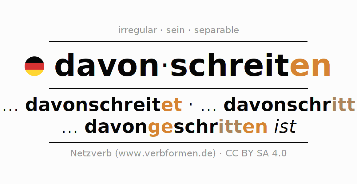 The conjugation of davonschreiten in Subjunctive Present Form of possibility Active is ... ich davonschreite, ... du davonschreitest, ... er davonschreite, ... wir davonschreiten, ... ihr davonschreitet, ... sie davonschreiten.The conjugation corresponds to certain grammatical rules. Likewise the requirements for the conjugation of the simple verb forms of davonschreiten in Present Subjunctive. Comments ☆