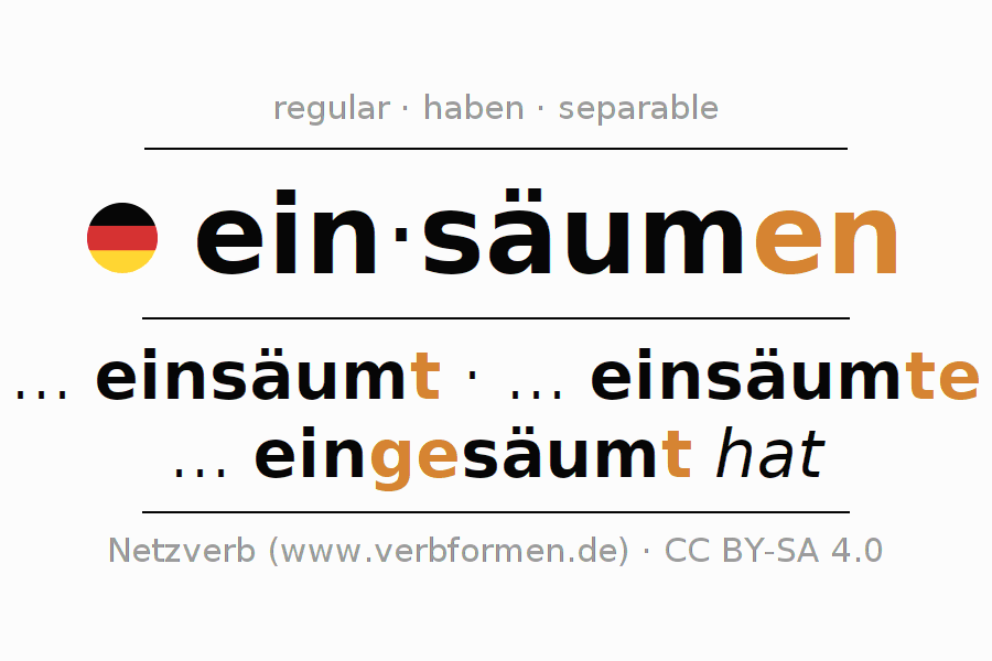 The verb einsäumen fully conjugated in all persons and numbers in the Subjunctive Present