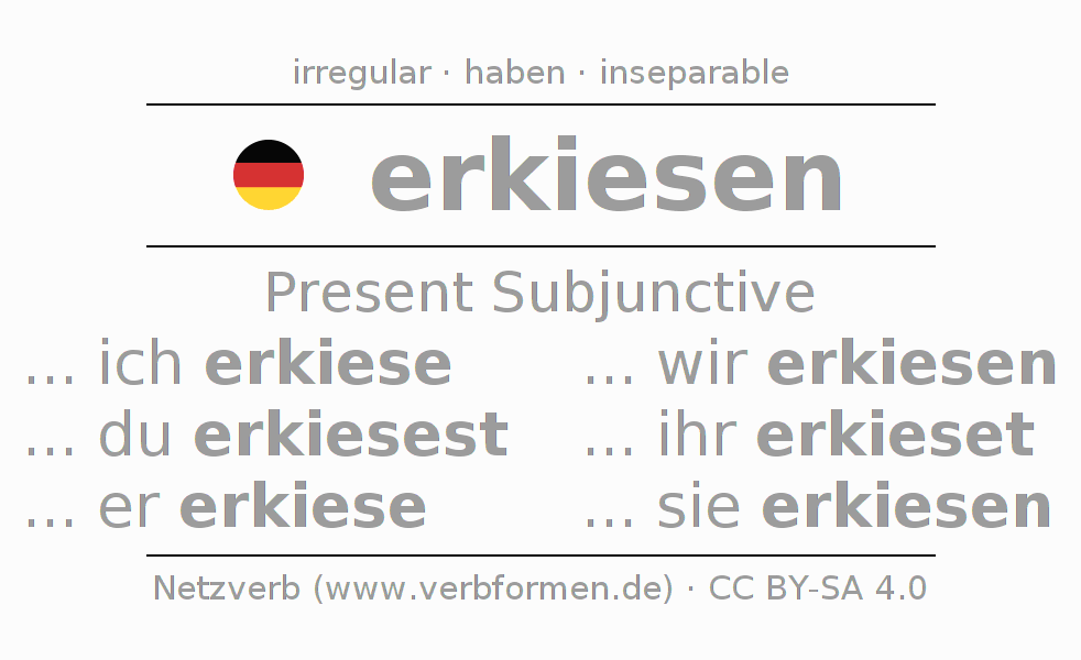 The conjugation of erkiesen in Subjunctive Present Form of possibility Active is ... ich erkiese, ... du erkiesest, ... er erkiese, ... wir erkiesen, ... ihr erkieset, ... sie erkiesen.The conjugation corresponds to certain grammatical rules. Likewise the requirements for the conjugation of the simple verb forms of erkiesen in Present Subjunctive. Comments ☆