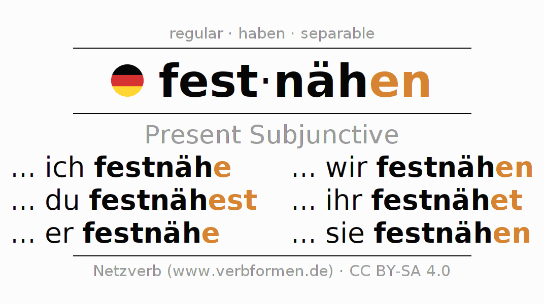 The verb festnähen fully conjugated in all persons and numbers in the Subjunctive Present