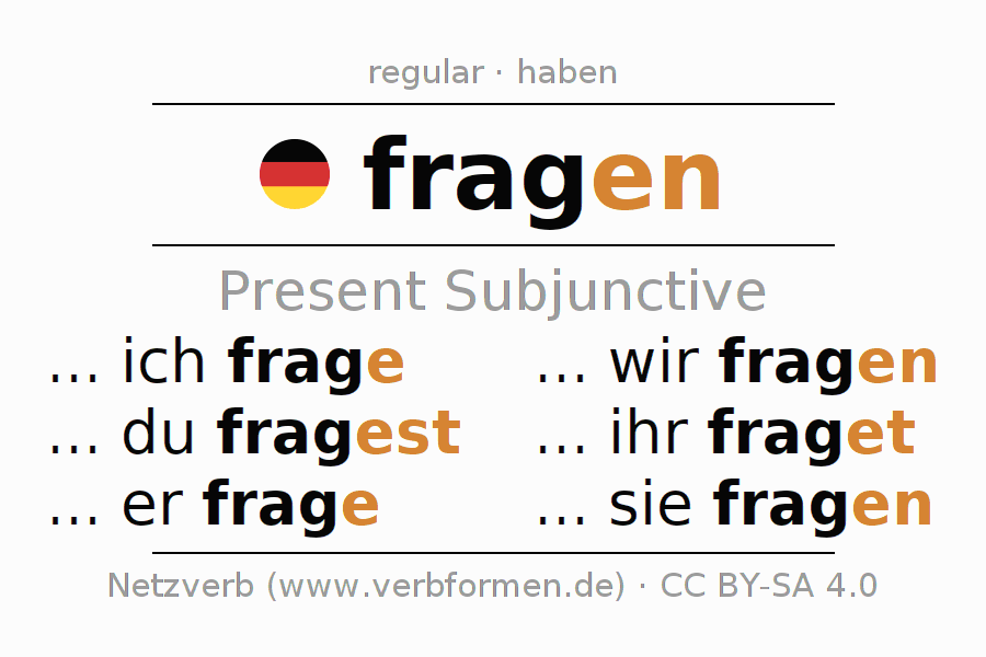 The conjugation of fragen in Subjunctive Present Form of possibility Active is ... ich frage, ... du fragest, ... er frage, ... wir fragen, ... ihr fraget, ... sie fragen.The conjugation corresponds to certain grammatical rules. Likewise the requirements for the conjugation of the simple verb forms of fragen in Present Subjunctive. Comments ☆