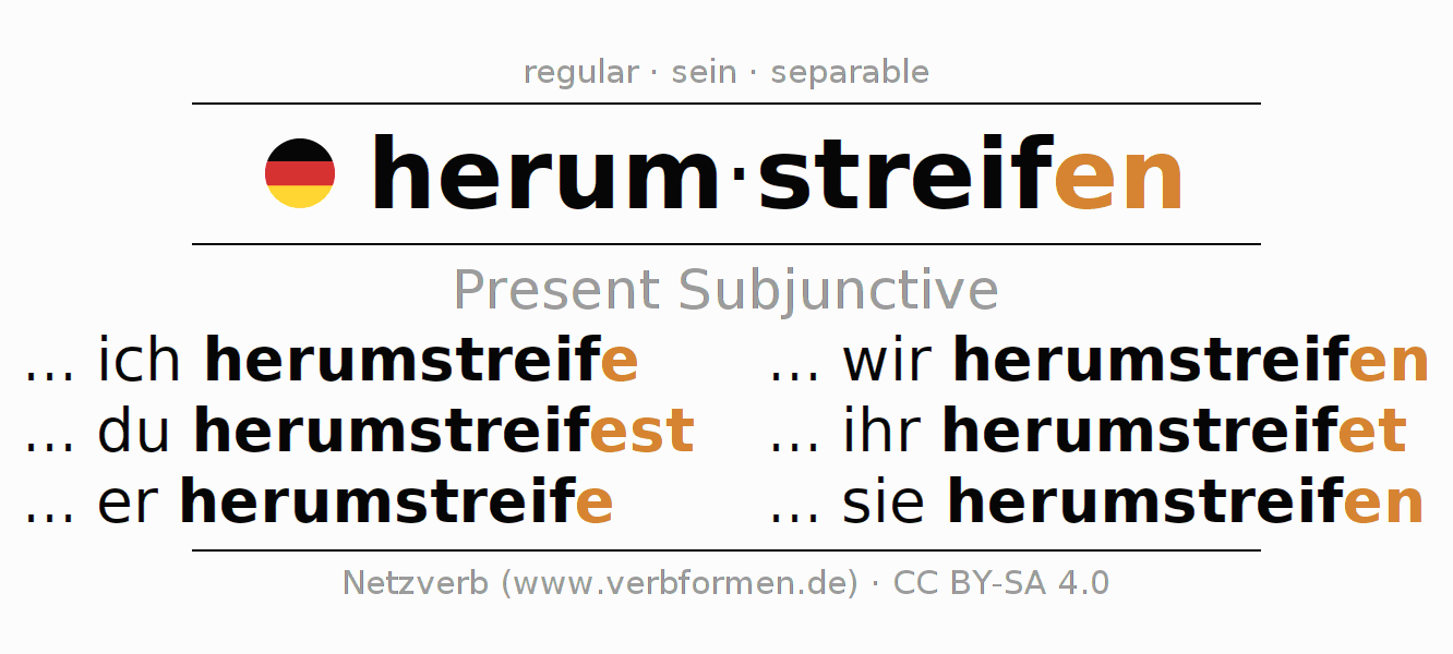 The conjugation of herumstreifen in Subjunctive Present Form of possibility Active is ... ich herumstreife, ... du herumstreifest, ... er herumstreife, ... wir herumstreifen, ... ihr herumstreifet, ... sie herumstreifen.The conjugation corresponds to certain grammatical rules. Likewise the requirements for the conjugation of the simple verb forms of herumstreifen in Present Subjunctive. Comments ☆