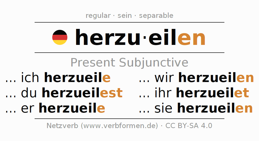 The verb herzueilen fully conjugated in all persons and numbers in the Subjunctive Present
