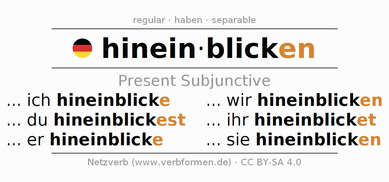 The verb hineinblicken fully conjugated in all persons and numbers in the Subjunctive Present