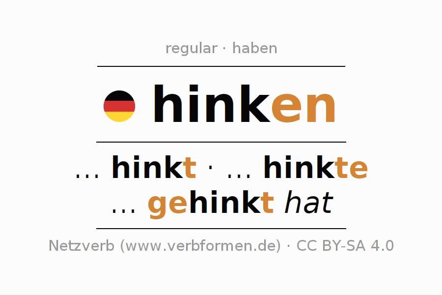 The conjugation of hinken in Subjunctive Present Form of possibility Active is ... ich hinke, ... du hinkest, ... er hinke, ... wir hinken, ... ihr hinket, ... sie hinken.The conjugation corresponds to certain grammatical rules. Likewise the requirements for the conjugation of the simple verb forms of hinken in Present Subjunctive. Comments ☆