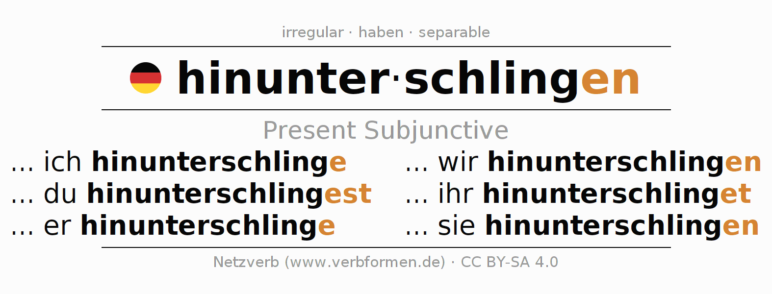 The verb hinunterschlingen fully conjugated in all persons and numbers in the Subjunctive Present