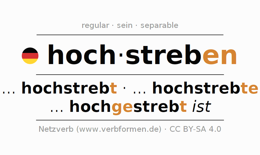 The conjugation of hochstreben in Subjunctive Present Form of possibility Active is ... ich hochstrebe, ... du hochstrebest, ... er hochstrebe, ... wir hochstreben, ... ihr hochstrebet, ... sie hochstreben.The conjugation corresponds to certain grammatical rules. Likewise the requirements for the conjugation of the simple verb forms of hochstreben in Present Subjunctive. Comments ☆