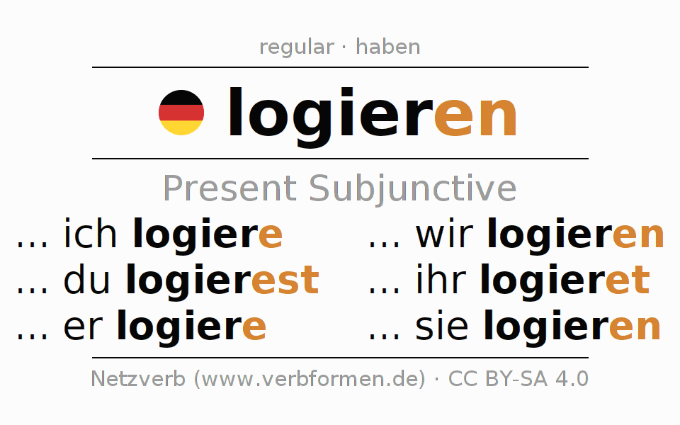 The verb logieren fully conjugated in all persons and numbers in the Subjunctive Present