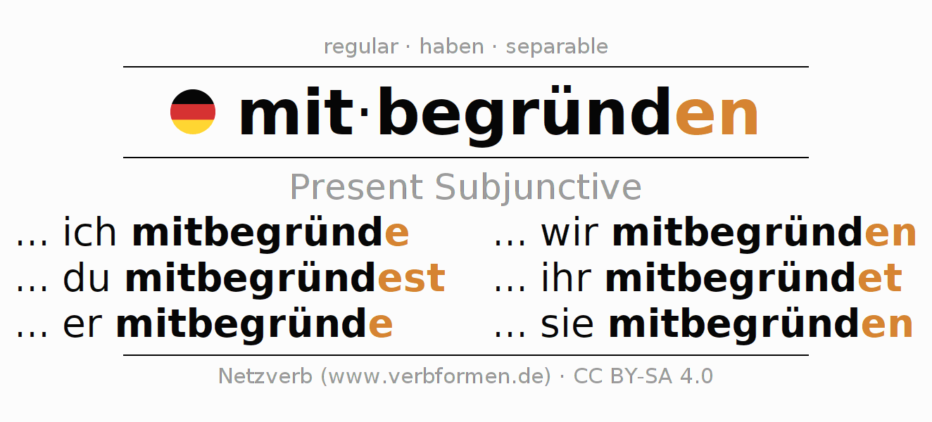 The verb mitbegründen fully conjugated in all persons and numbers in the Subjunctive Present