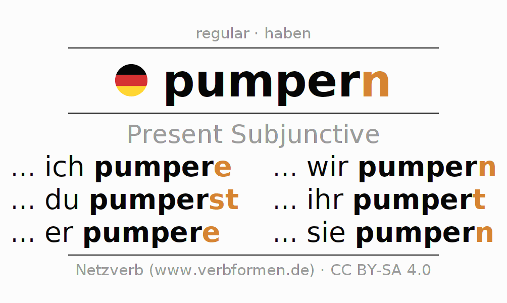 The conjugation of pumpern in Subjunctive Present Form of possibility Active is ... ich pump(e)re, ... du pumperst, ... er pump(e)re, ... wir pumpern, ... ihr pumpert, ... sie pumpern.The conjugation corresponds to certain grammatical rules. Likewise the requirements for the conjugation of the simple verb forms of pumpern in Present Subjunctive. Comments ☆