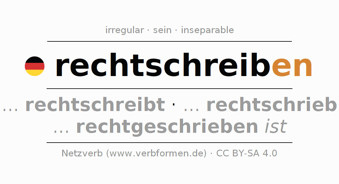 The conjugation of rechtschreiben in Subjunctive Present Form of possibility Active is ... ich rechtschreibe, ... du rechtschreibest, ... er rechtschreibe, ... wir rechtschreiben, ... ihr rechtschreibet, ... sie rechtschreiben.The conjugation corresponds to certain grammatical rules. Likewise the requirements for the conjugation of the simple verb forms of rechtschreiben in Present Subjunctive. Comments ☆