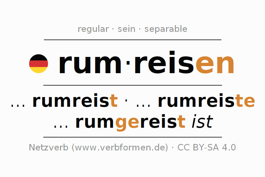 The conjugation of rumreisen in Subjunctive Present Form of possibility Active is ... ich rumreise, ... du rumreisest, ... er rumreise, ... wir rumreisen, ... ihr rumreiset, ... sie rumreisen.The conjugation corresponds to certain grammatical rules. Likewise the requirements for the conjugation of the simple verb forms of rumreisen in Present Subjunctive. Comments ☆