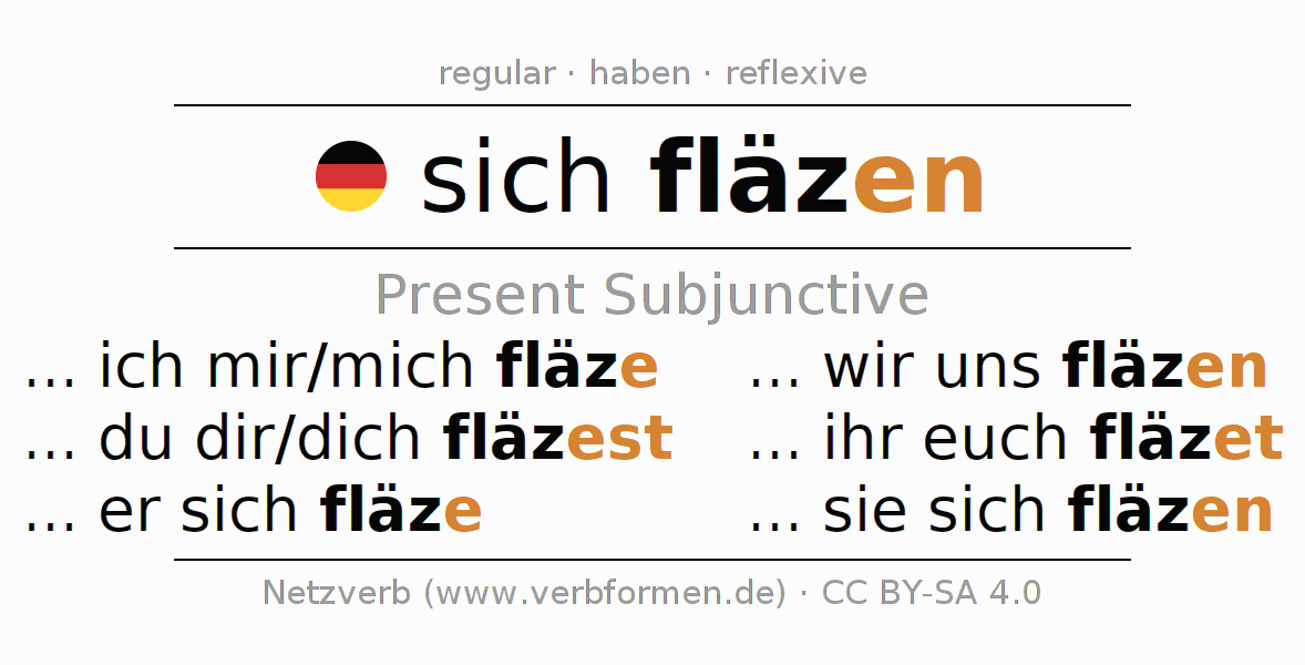 The verb sich fläzen fully conjugated in all persons and numbers in the Subjunctive Present
