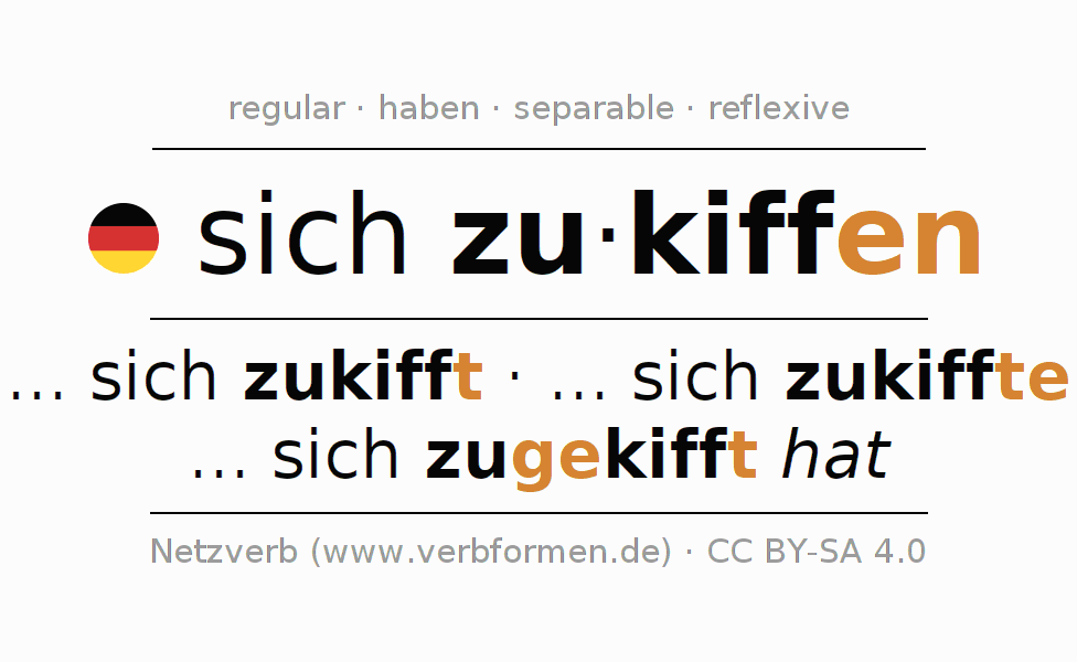 The conjugation of sich zukiffen in Subjunctive Present Form of possibility Active is ... ich mir/mich zukiffe, ... du dir/dich zukiffest, ... er sich zukiffe, ... wir uns zukiffen, ... ihr euch zukiffet, ... sie sich zukiffen.The conjugation corresponds to certain grammatical rules. Likewise the requirements for the conjugation of the simple verb forms of zukiffen in Present Subjunctive. Comments ☆