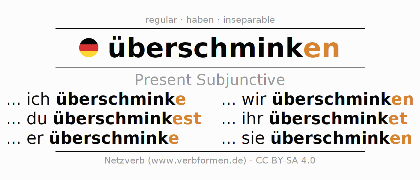 The verb überschminken fully conjugated in all persons and numbers in the Subjunctive Present