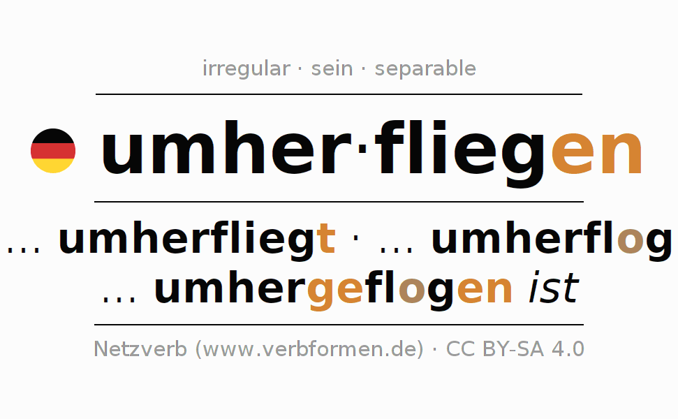 The conjugation of umherfliegen in Subjunctive Present Form of possibility Active is ... ich umherfliege, ... du umherfliegest, ... er umherfliege, ... wir umherfliegen, ... ihr umherflieget, ... sie umherfliegen.The conjugation corresponds to certain grammatical rules. Likewise the requirements for the conjugation of the simple verb forms of umherfliegen in Present Subjunctive. Comments ☆