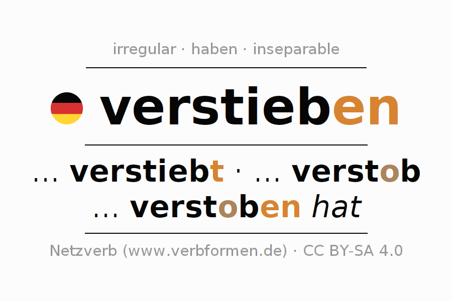 The conjugation of verstieben in Subjunctive Present Form of possibility Active is ... ich verstiebe, ... du verstiebest, ... er verstiebe, ... wir verstieben, ... ihr verstiebet, ... sie verstieben.The conjugation corresponds to certain grammatical rules. Likewise the requirements for the conjugation of the simple verb forms of verstieben in Present Subjunctive. Comments ☆