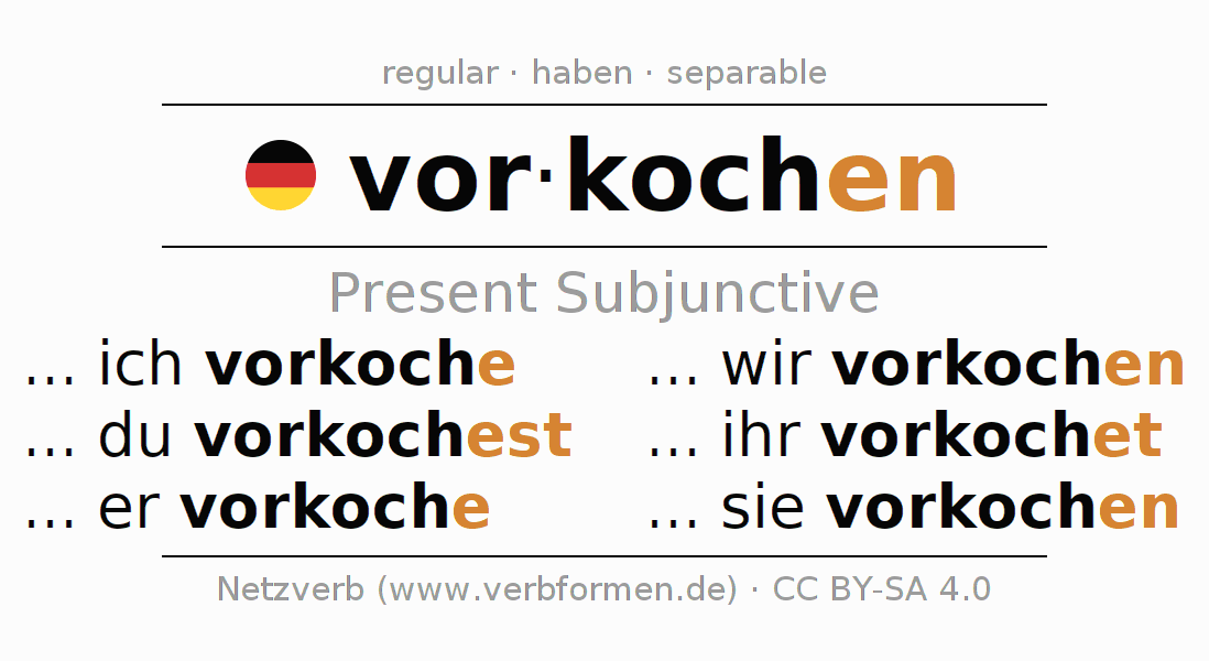 The conjugation of vorkochen in Subjunctive Present Form of possibility Active is ... ich vorkoche, ... du vorkochest, ... er vorkoche, ... wir vorkochen, ... ihr vorkochet, ... sie vorkochen.The conjugation corresponds to certain grammatical rules. Likewise the requirements for the conjugation of the simple verb forms of vorkochen in Present Subjunctive. Comments ☆