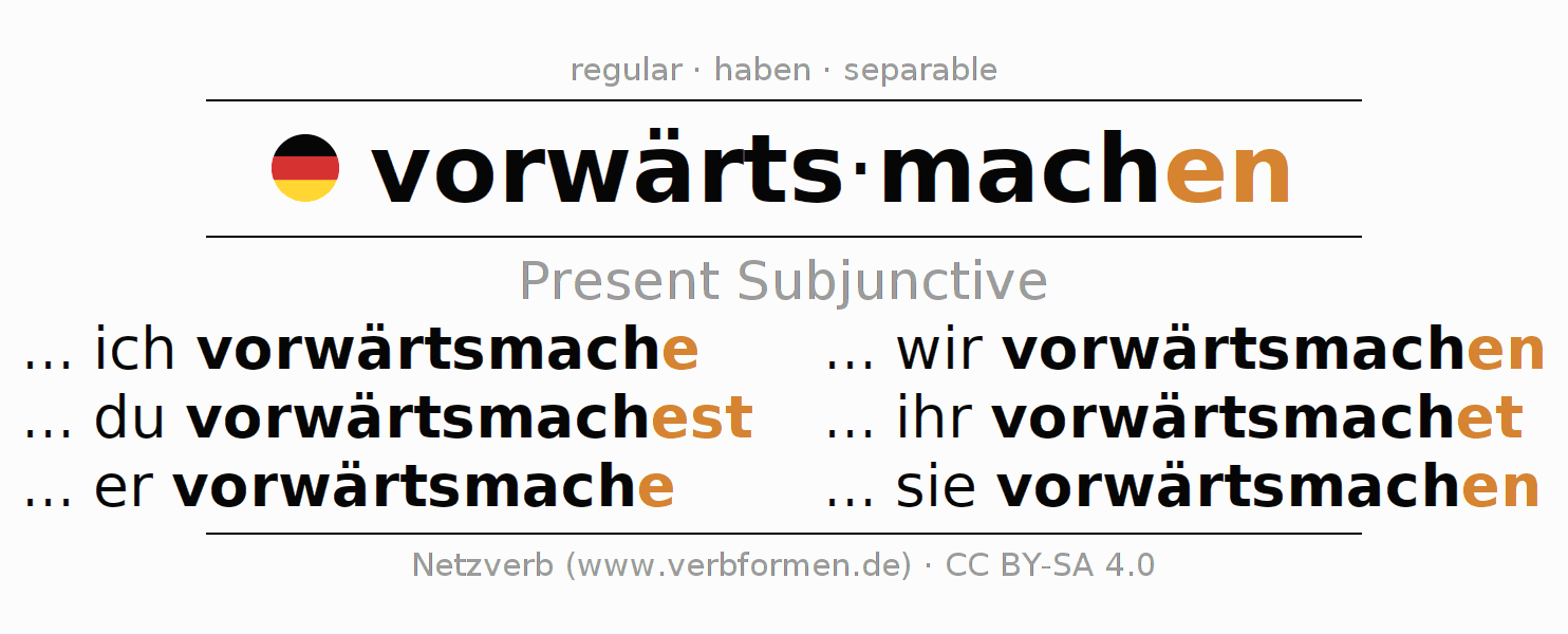 The verb vorwärtsmachen fully conjugated in all persons and numbers in the Subjunctive Present