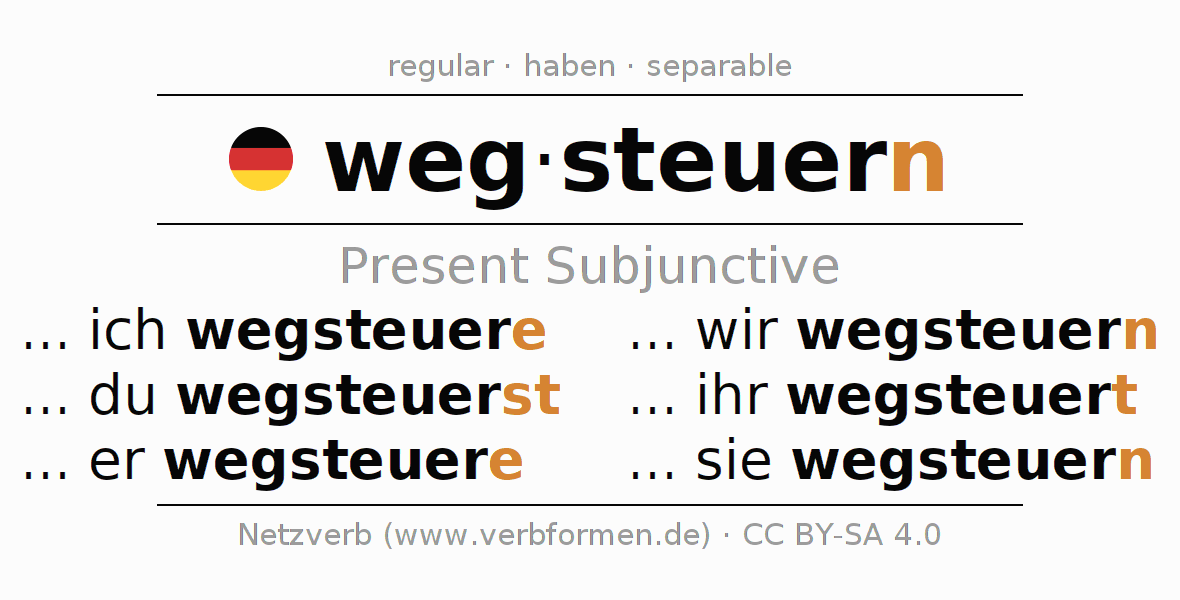 The verb wegsteuern fully conjugated in all persons and numbers in the Subjunctive Present