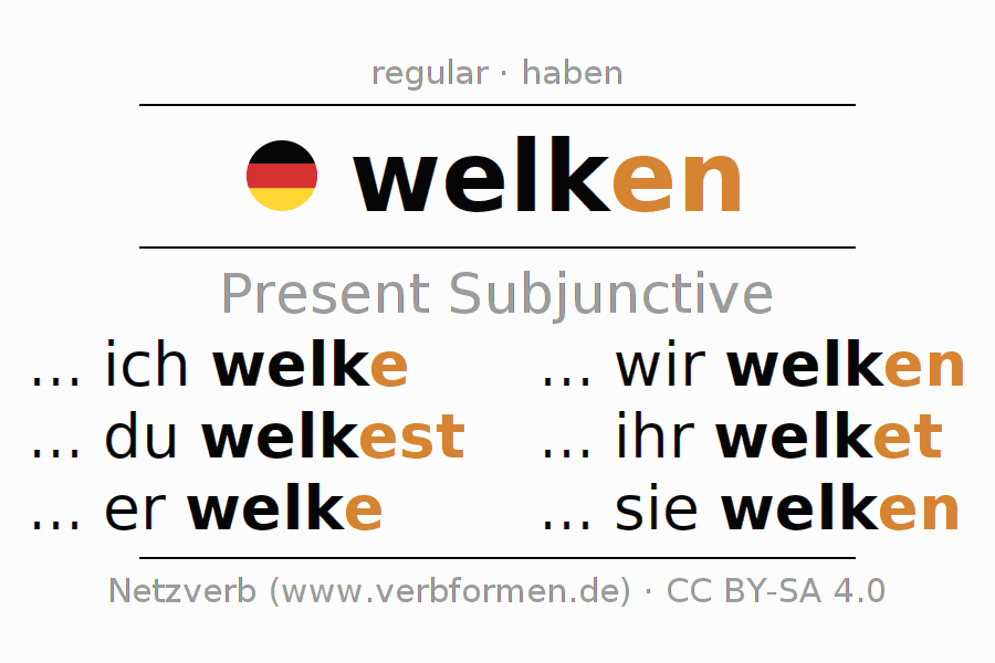 The conjugation of welken in Subjunctive Present Form of possibility Active is ... ich welke, ... du welkest, ... er welke, ... wir welken, ... ihr welket, ... sie welken.The conjugation corresponds to certain grammatical rules. Likewise the requirements for the conjugation of the simple verb forms of welken in Present Subjunctive. Comments ☆