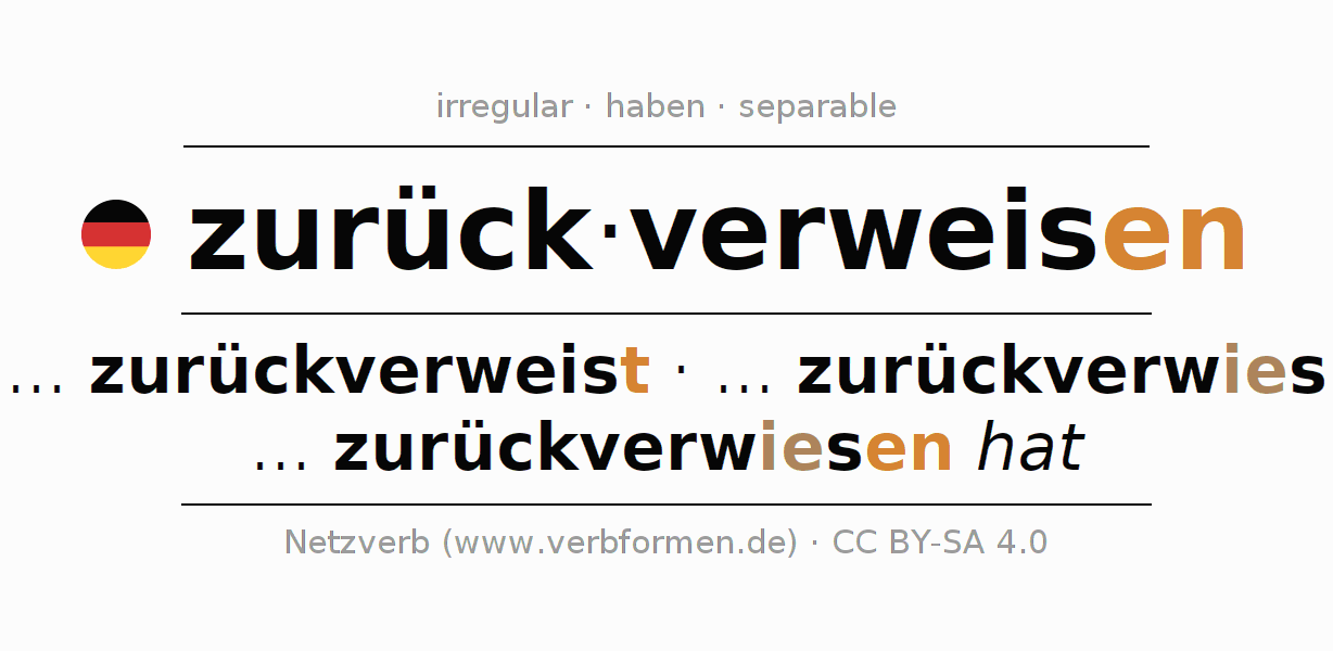 The conjugation of zurückverweisen in Subjunctive Present Form of possibility Active is ... ich zurückverweise, ... du zurückverweisest, ... er zurückverweise, ... wir zurückverweisen, ... ihr zurückverweiset, ... sie zurückverweisen.The conjugation corresponds to certain grammatical rules. Likewise the requirements for the conjugation of the simple verb forms of zurückverweisen in Present Subjunctive. Comments ☆