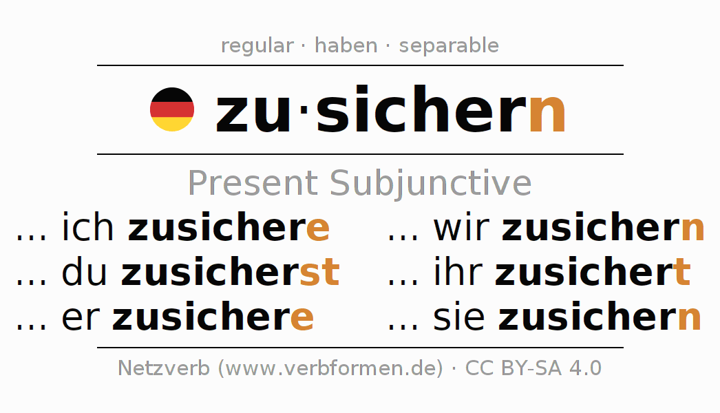 The verb zusichern fully conjugated in all persons and numbers in the Subjunctive Present