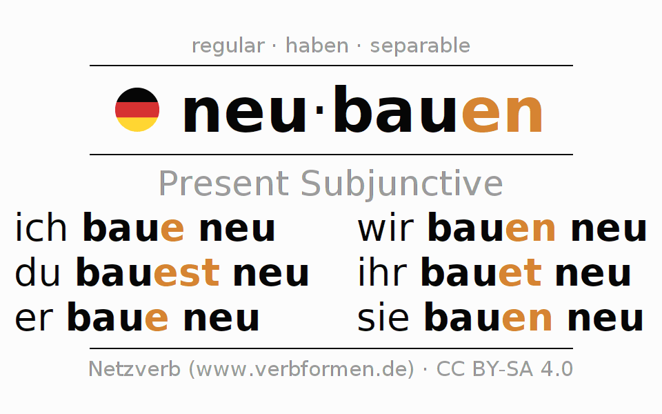 The verb neubauen fully conjugated in all persons and numbers in the Subjunctive Present