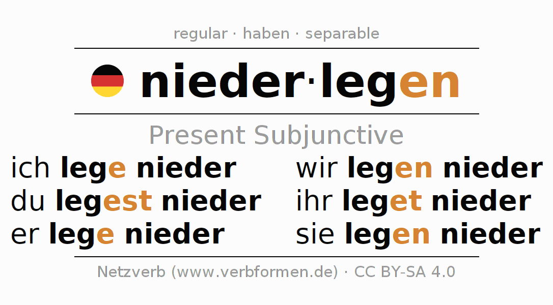 The verb niederlegen fully conjugated in all persons and numbers in the Subjunctive Present