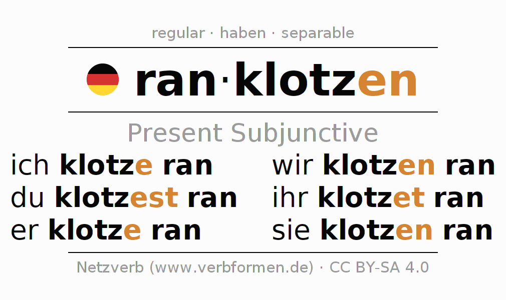 The verb ranklotzen fully conjugated in all persons and numbers in the Subjunctive Present
