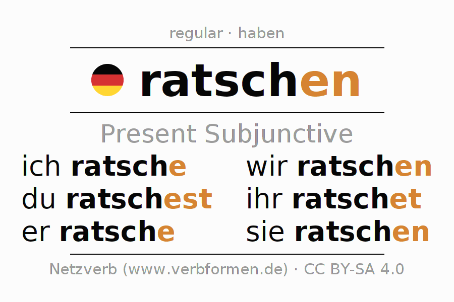 The verb ratschen fully conjugated in all persons and numbers in the Subjunctive Present