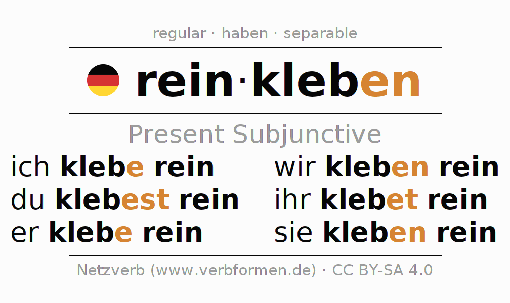 The verb reinkleben fully conjugated in all persons and numbers in the Subjunctive Present