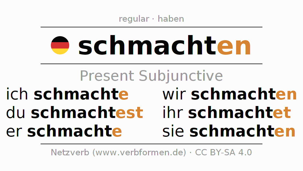 The verb schmachten fully conjugated in all persons and numbers in the Subjunctive Present