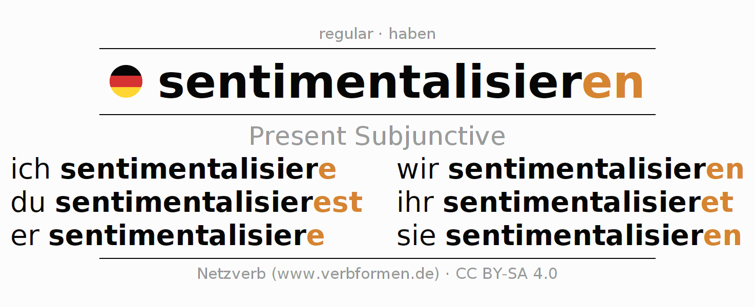 The verb sentimentalisieren fully conjugated in all persons and numbers in the Subjunctive Present