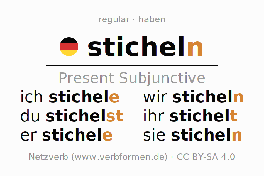 The verb sticheln fully conjugated in all persons and numbers in the Subjunctive Present