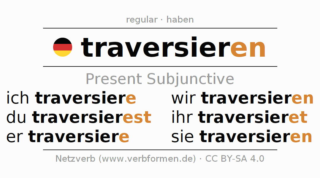 The verb traversieren fully conjugated in all persons and numbers in the Subjunctive Present