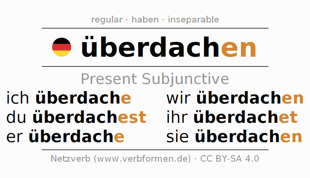 The conjugation of überdachen (roof over, cover) in subjunctive I is: ich überdache, du überdachest, er überdache, wir überdachen, ihr überdachet, sie überdachen. The endings -e, -est, -e, -en, -et, -en are appended to the base or verb stem dach. The conjugation of these forms conforms to the grammatical rules for verbs in the subjunctive I tense.