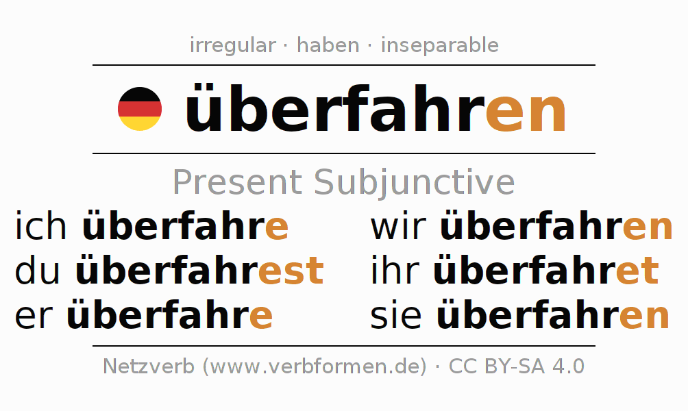 The verb überfahren fully conjugated in all persons and numbers in the Subjunctive Present