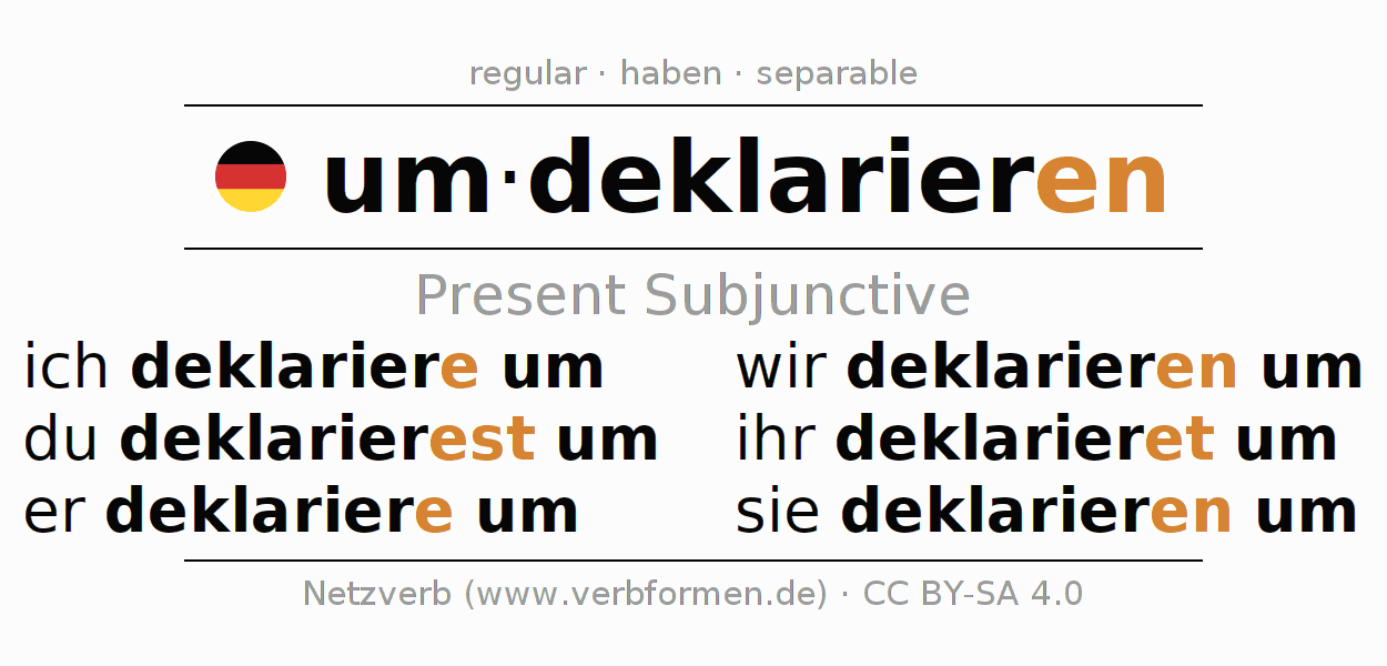 The verb umdeklarieren fully conjugated in all persons and numbers in the Subjunctive Present