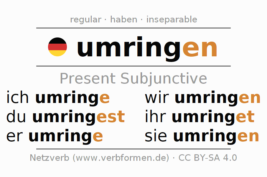 The verb umringen fully conjugated in all persons and numbers in the Subjunctive Present