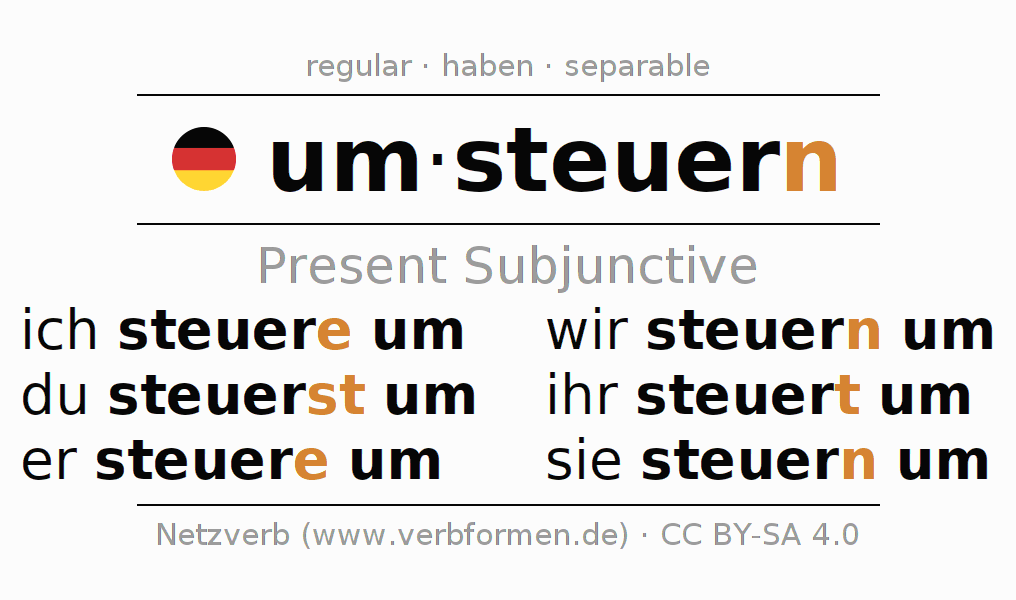 The verb umsteuern fully conjugated in all persons and numbers in the Subjunctive Present