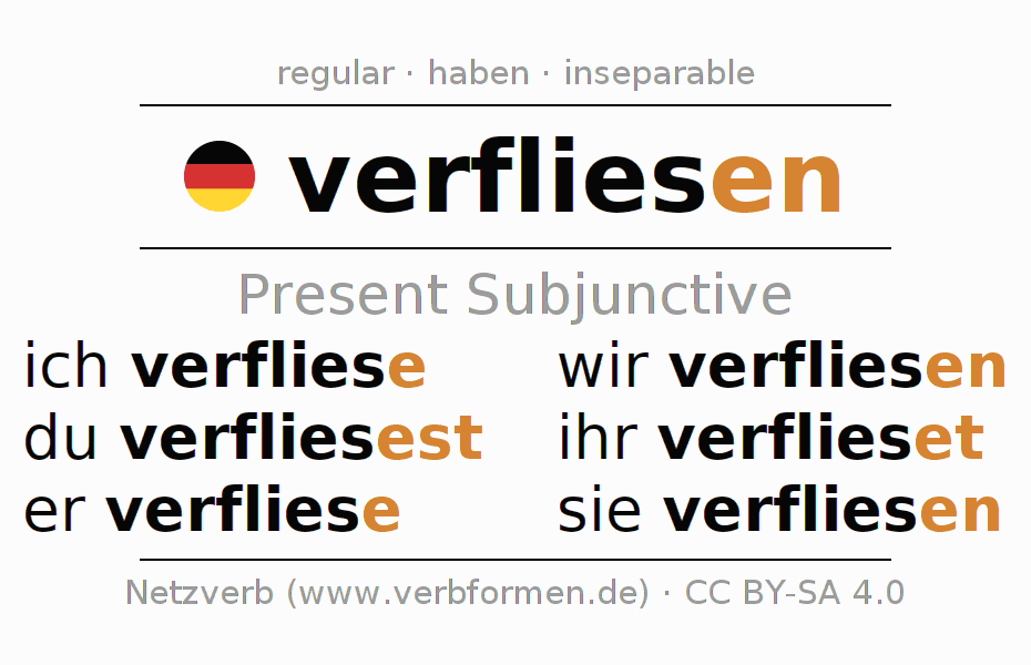 The verb verfliesen fully conjugated in all persons and numbers in the Subjunctive Present