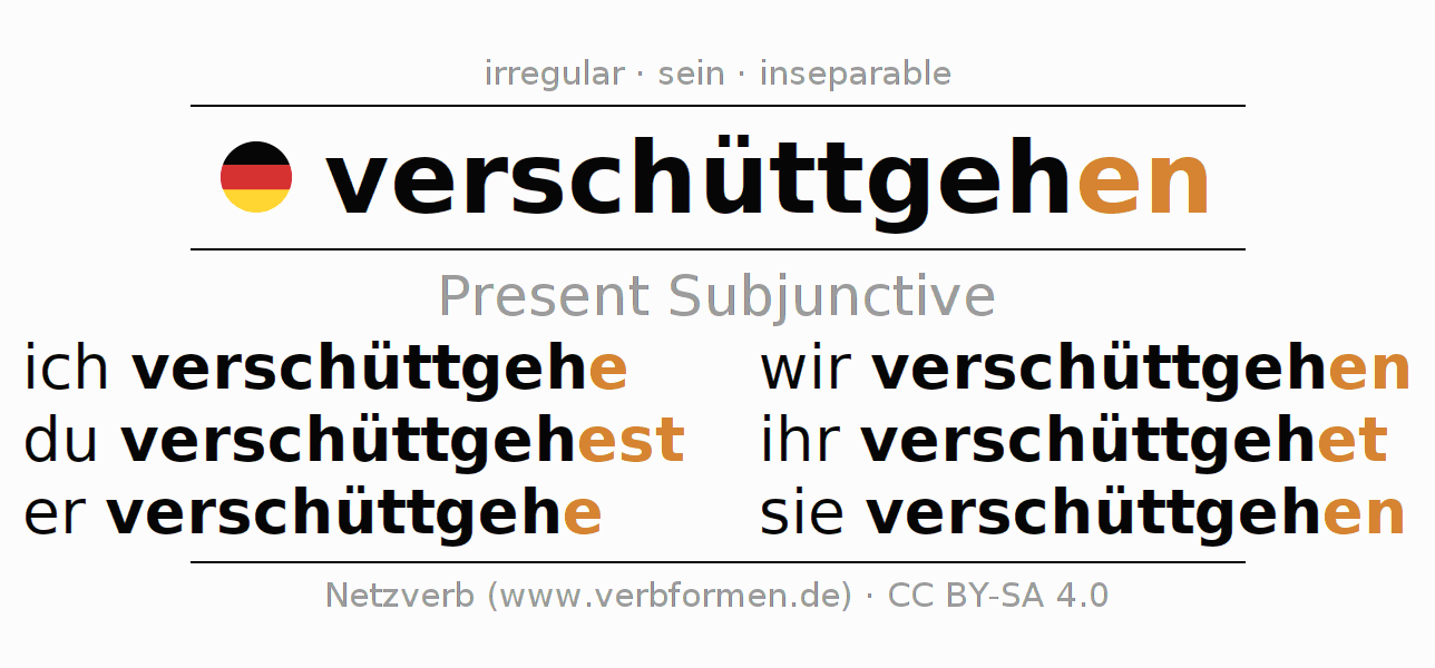 The verb verschüttgehen fully conjugated in all persons and numbers in the Subjunctive Present