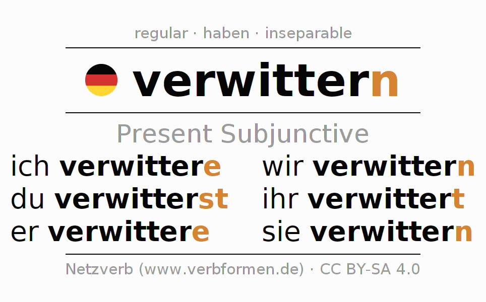 The verb verwittern (hat) fully conjugated in all persons and numbers in the Subjunctive Present