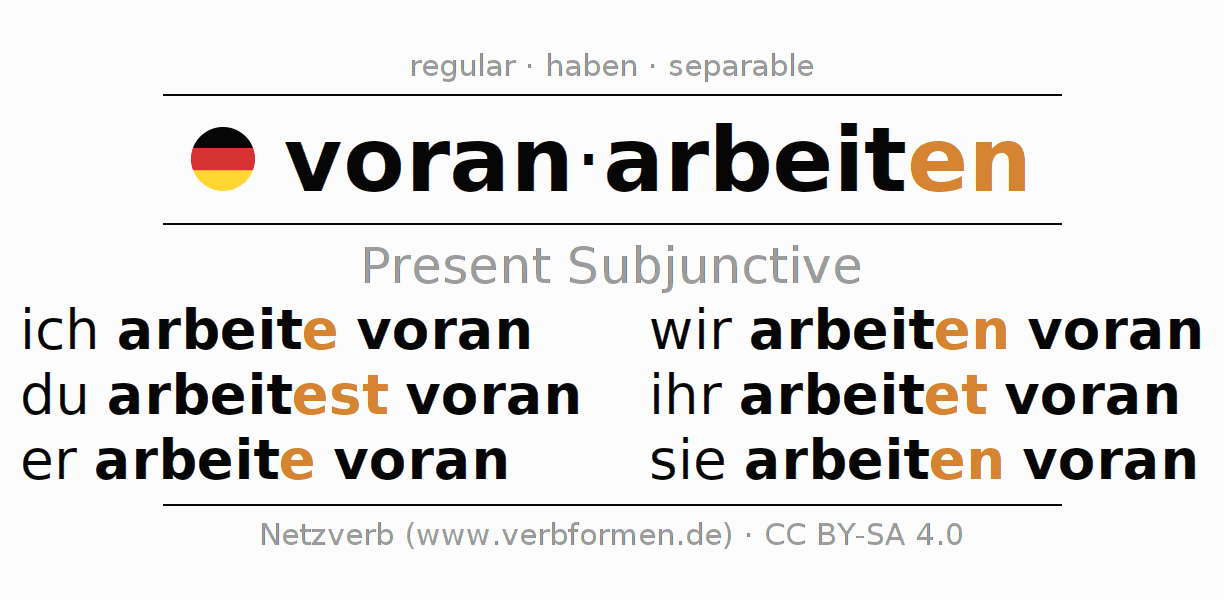 The verb voranarbeiten fully conjugated in all persons and numbers in the Subjunctive Present