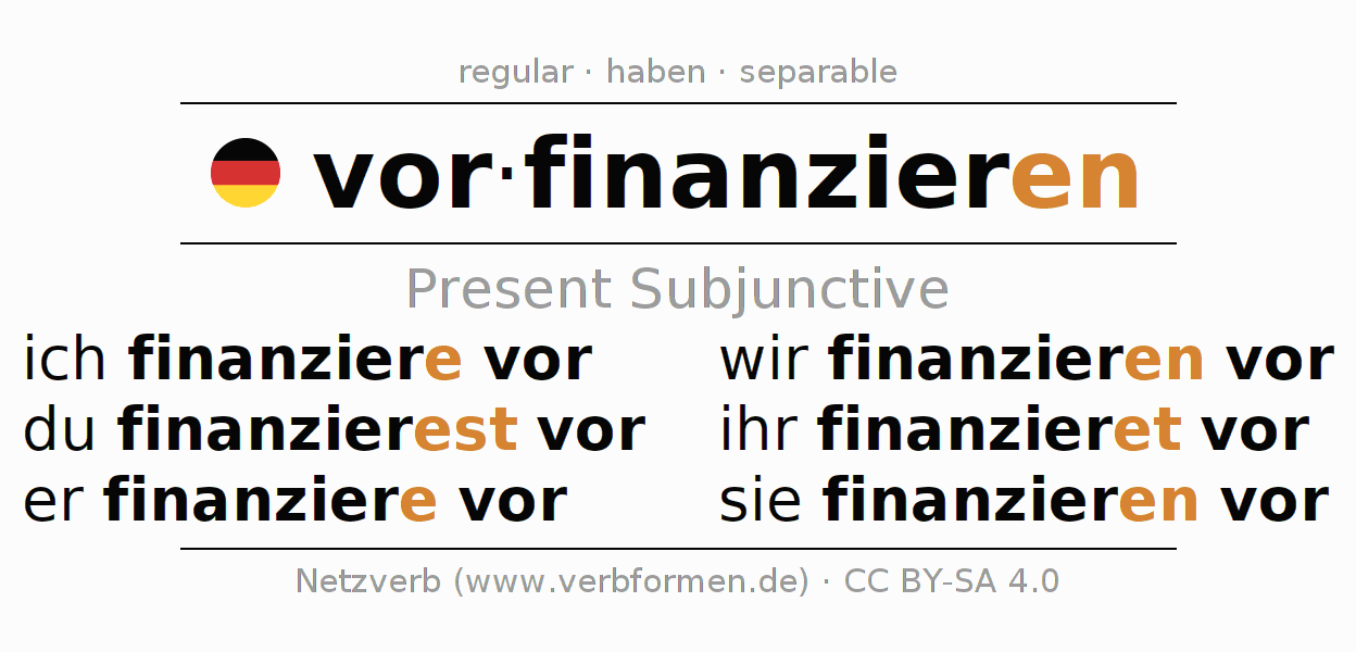 The verb vorfinanzieren fully conjugated in all persons and numbers in the Subjunctive Present