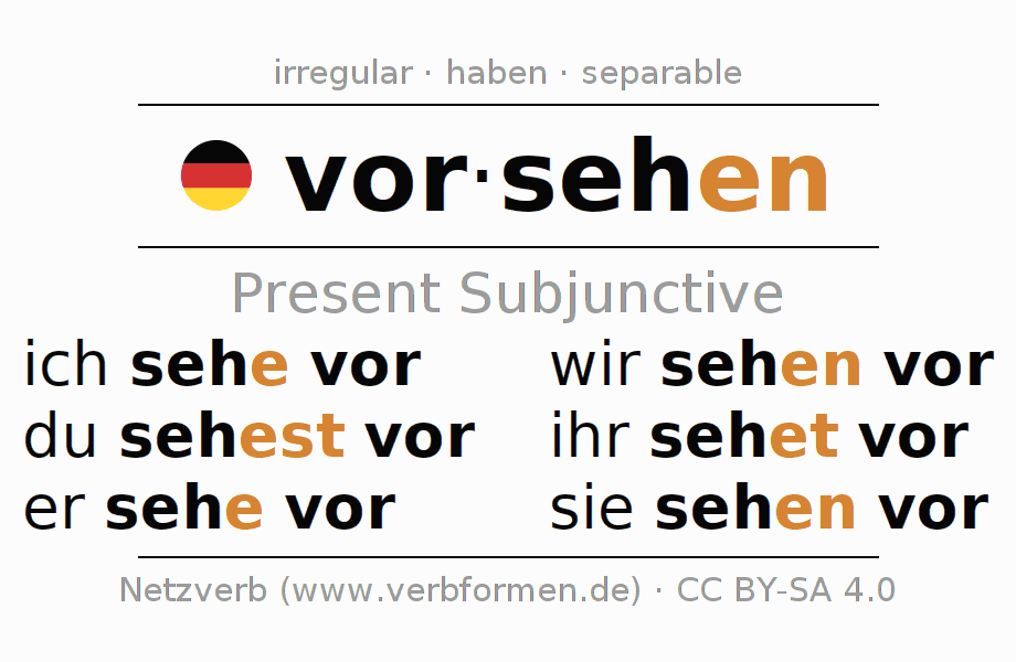 The verb vorsehen fully conjugated in all persons and numbers in the Subjunctive Present