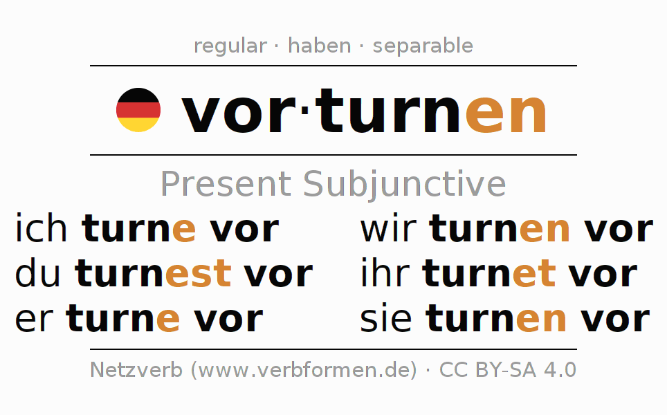 The verb vorturnen fully conjugated in all persons and numbers in the Subjunctive Present