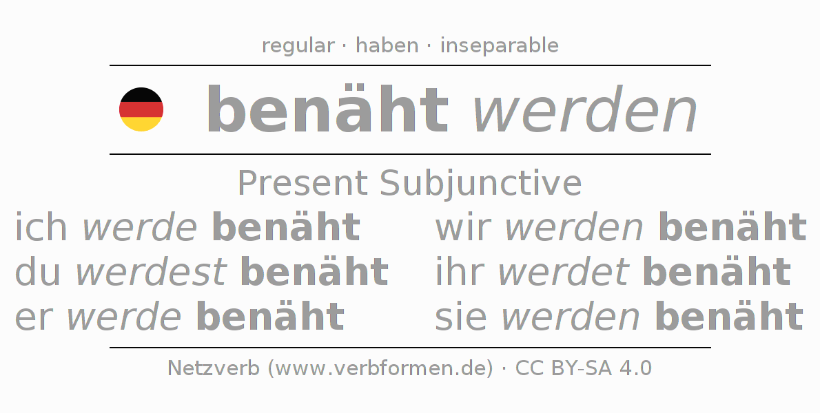 The verb benähen fully conjugated in all persons and numbers in the Subjunctive Present